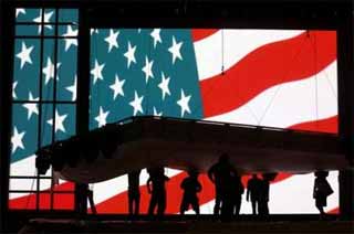 Stagehands work on the main stage for the Republican National Convention in New York City's Madison Square Gardens, Tuesday, August 24, 2004. The Republicans will meet August 30 through September 2. (AP Photo/Adam Hunger)