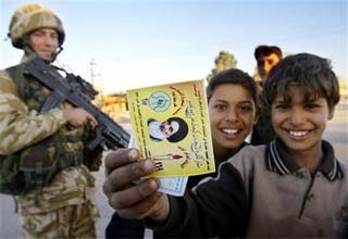Iraqi youngsters display an election pamphlet, as a British soldier on patrol in the southern Iraqi city of Basra, looks on, Wednesday Jan. 2005, as Iraq heads for national elections scheduled for January 30.(AP Photo/Odd Anderson, pool)