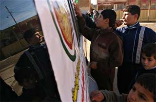 Children examine election posters displayed on a campaign vehicle as Kurdish women's rights activists raise election awareness among poor and often illiterate women in suburbs of Arbil, Wednesday, Jan. 26. 2005. Kurds are expected to attend the forthcoming elections in Iraq in overwhelming numbers thus strengthening their position in the interim Iraqi parliament. (AP Photo/Sasa Kralj)