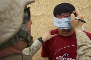 A U.S. Marine writes an identification number on the forehead of an Iraqi man detained during a search in Haditha, 220 kilometers (140 miles) northwest of Baghdad, Wednesday, May 25, 2005.