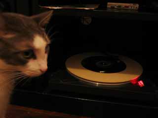 Uh-oh, battle of the hipster cats! Here's Emmitt, about to get into some trouble with the turntable...let's hope he can "scratch" better than that documentary by Doug Pray! The seven-inch on the decks, meanwhile, is a Team Doyobi release on SKAM. Judging by Emmitt's disapproving facial expression, I'd wager he can't stand the distorted electro-grunge of Manchester's best. "Take that, Coolfer," he seems to be saying! :)