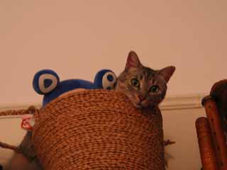 Two cuties in one photo! Vincent peers out from the basket atop the bookshelf, while the topmost portion of our stuffed Murakami doll creeps up behind him. Who will win this fight? I'm going with the cat.